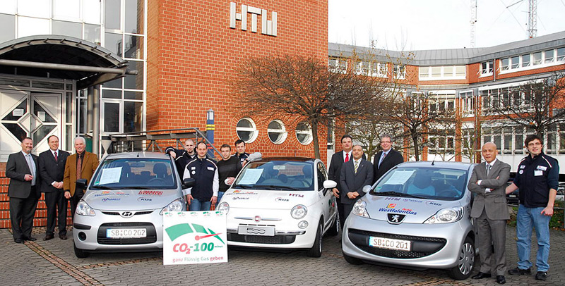 Forschung und Wissenschaft arbeiten mit Hochdruck an der Effizienz-Steigerung dieser Antriebsart in ökologischer und ökonomischer Hinsicht. An der «Hochschule für Technik und Wirtschaft des Saarlandes» (HTW) in Saarbrücken wurden jetzt die ersten Ergebnisse des Projektes «CO2-100minus» präsentiert. Der Projektauftrag war klar definiert: «Rüsten sie ein Auto auf Autogas um und optimieren sie es so, dass am Ende weniger als 100 Gramm CO2 pro Kilometer den Auspuff verlassen.» Weshalb das Projekt auch seinen Namen erhielt: «CO2-100minus.» Dazu arbeiteten die beiden Saarbrücker Wissenschaftler Prof. Dr. Thomas Heinze und Prof. Dr. Harald Altjohann mit Unterstützung von etwa einem Dutzend Partner aus der Industrie und zweier Ministerien seit Monaten an der Verwirklichung dieser Aufgabenstellung. Beim niederländischen Gasanlagen-Hersteller «Vialle» wurden ein Fiat 500 und ein Hyundai i10 auf Autogas umgerüstet. Im Benzinbetrieb wiesen die beiden «Autozwerge» mit ihren 69 bzw. 67 PS auf dem Papier eine CO2-Emmission von je 119 Gramm auf.