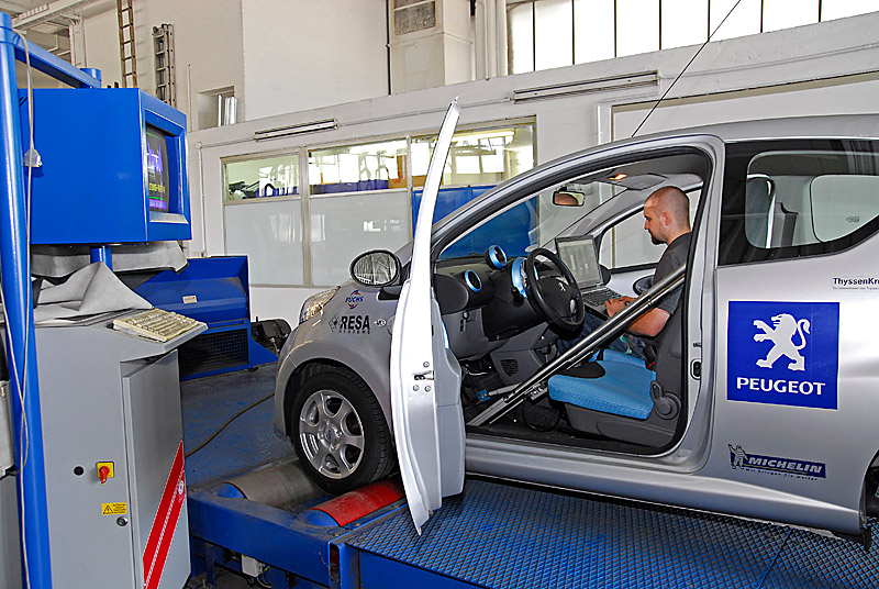 Denn in den Hallen der Saarbahn – gerade einmal 540 Meter vom Labor von Prof. Heinze entfernt – steht seit einiger Zeit ein Leistungsprüfstand. Der Rollenprüfstand LPS 2000 des Allgäuer Maschinenbauunternehmens MAHA wurde allerdings nur selten genutzt. Und so haben jetzt die Studenten von Prof. Heinze die Möglichkeit, hier ihre Forschungen durchzuführen. Natürlich gab es zunächst eine ordentliche Einweisung auch für die wissenschaftlichen Mitarbeiter Michael Fries und Volker Witte, bevor die Studenten ihre Experimente beginnen konnten.
