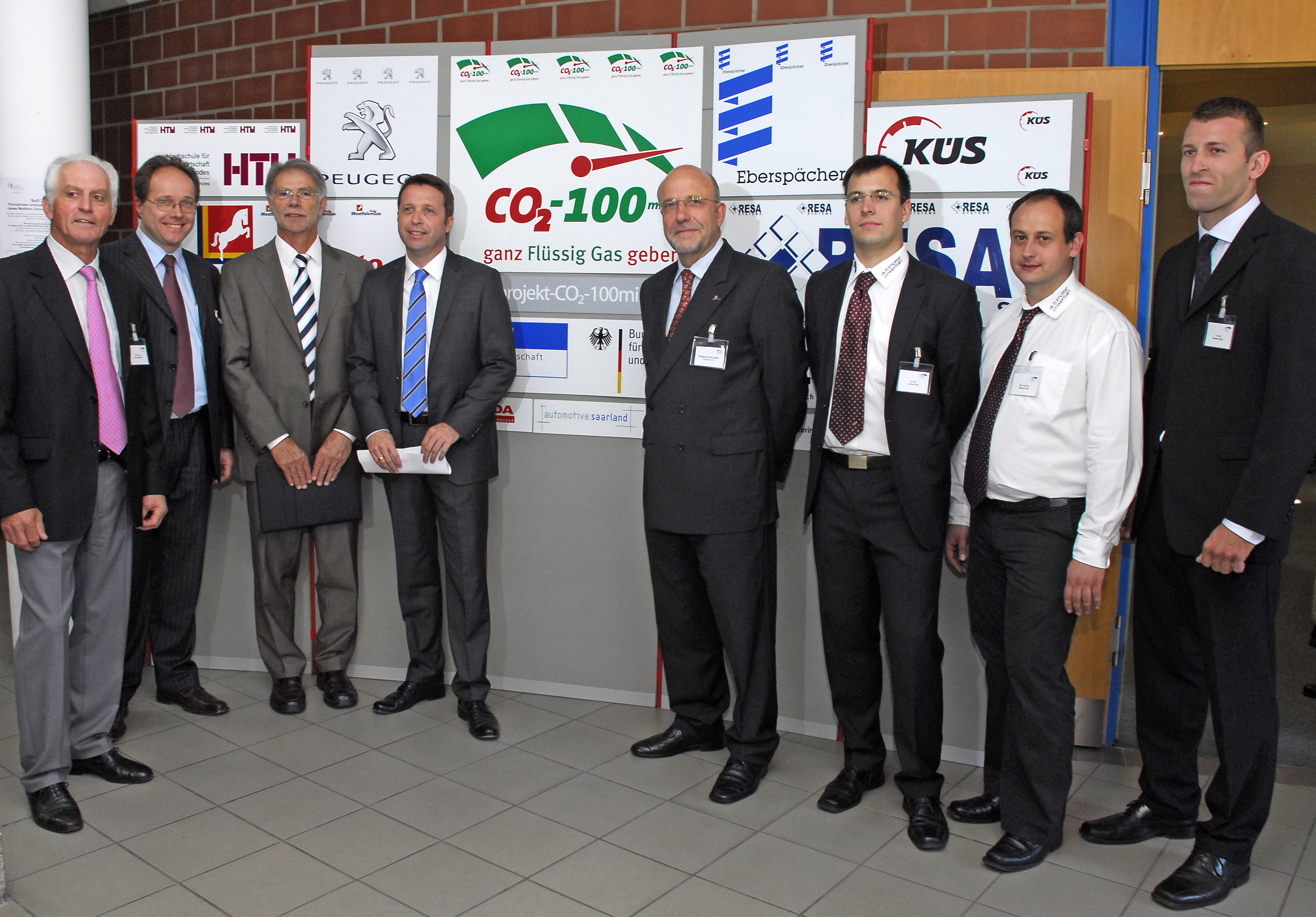 Sind sehr zufrieden mit dem Ergebnis des Projektes CO2-100minus (v.l.): Prof. Dr. Harald Altjohann, Prof. Dr. Thomas Heinze, HTW-Rektor Prof. Dr. Wolfgang Cornetz, Staatssekretär Peter Hauptmann, Westfalen AG-Vorstandsvorsitzender Wolfgang Fritsch-Albert, die wissenschaftlichen Mitarbeiter Jochen Diehl und Michael Fries sowie Student Wolfram Kirsch. Foto: Projekt CO2-100minus/Fontaine
