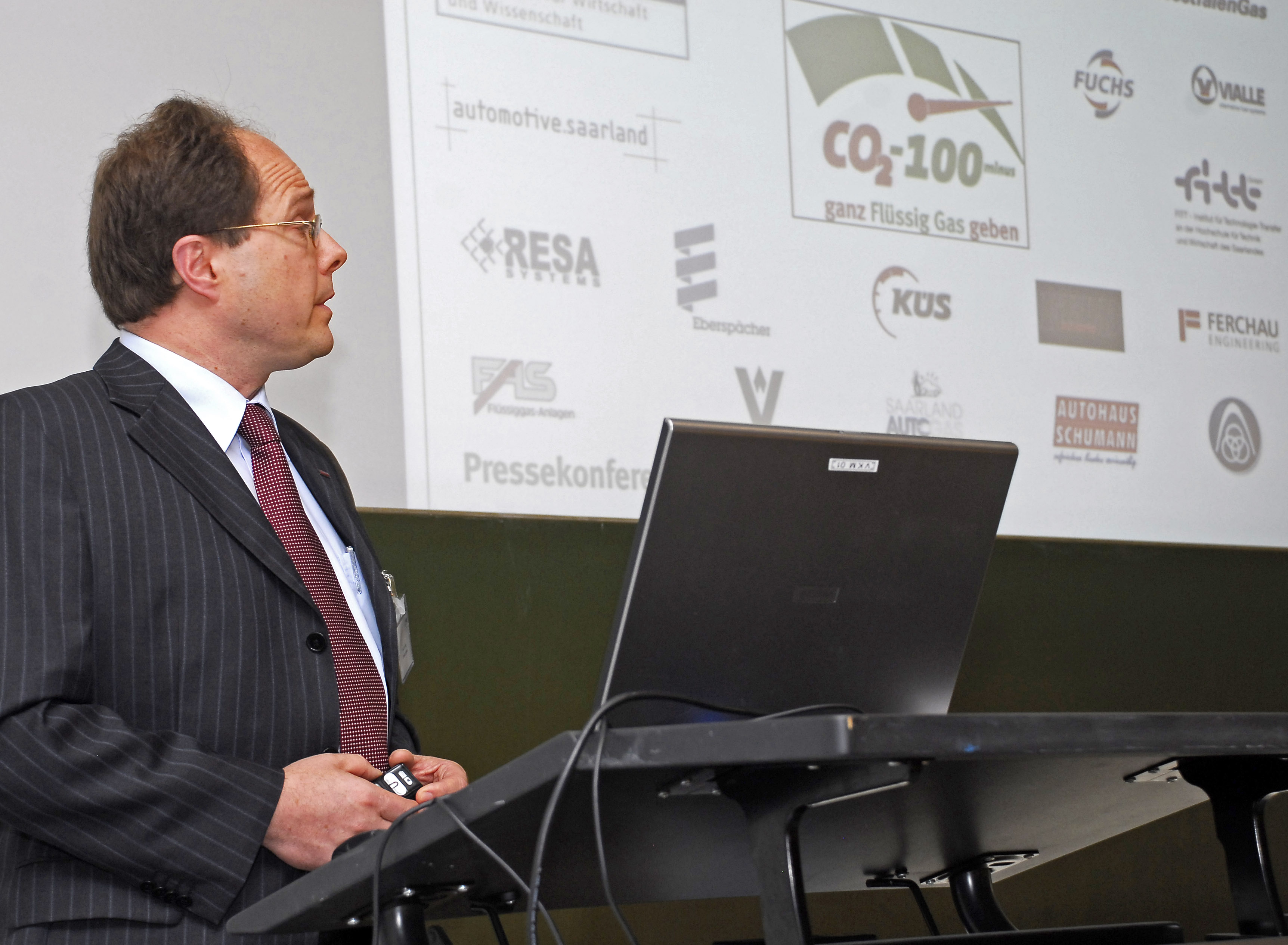 Prof. Dr. Harald Altjohann (2. v. l.) gibt im Beisein von Staatssekretär Peter Hauptmann (l.) HTW-Rektor Prof. Dr. Wolfgang Cornetz und dem Vorstandsvorsitzenden der Westfalen AG, Wolfgang Fritsch-Albert (r.), letzte Hinweise vor der Ergebnispräsentation. Foto: Projekt CO2-100minus/Fontaine