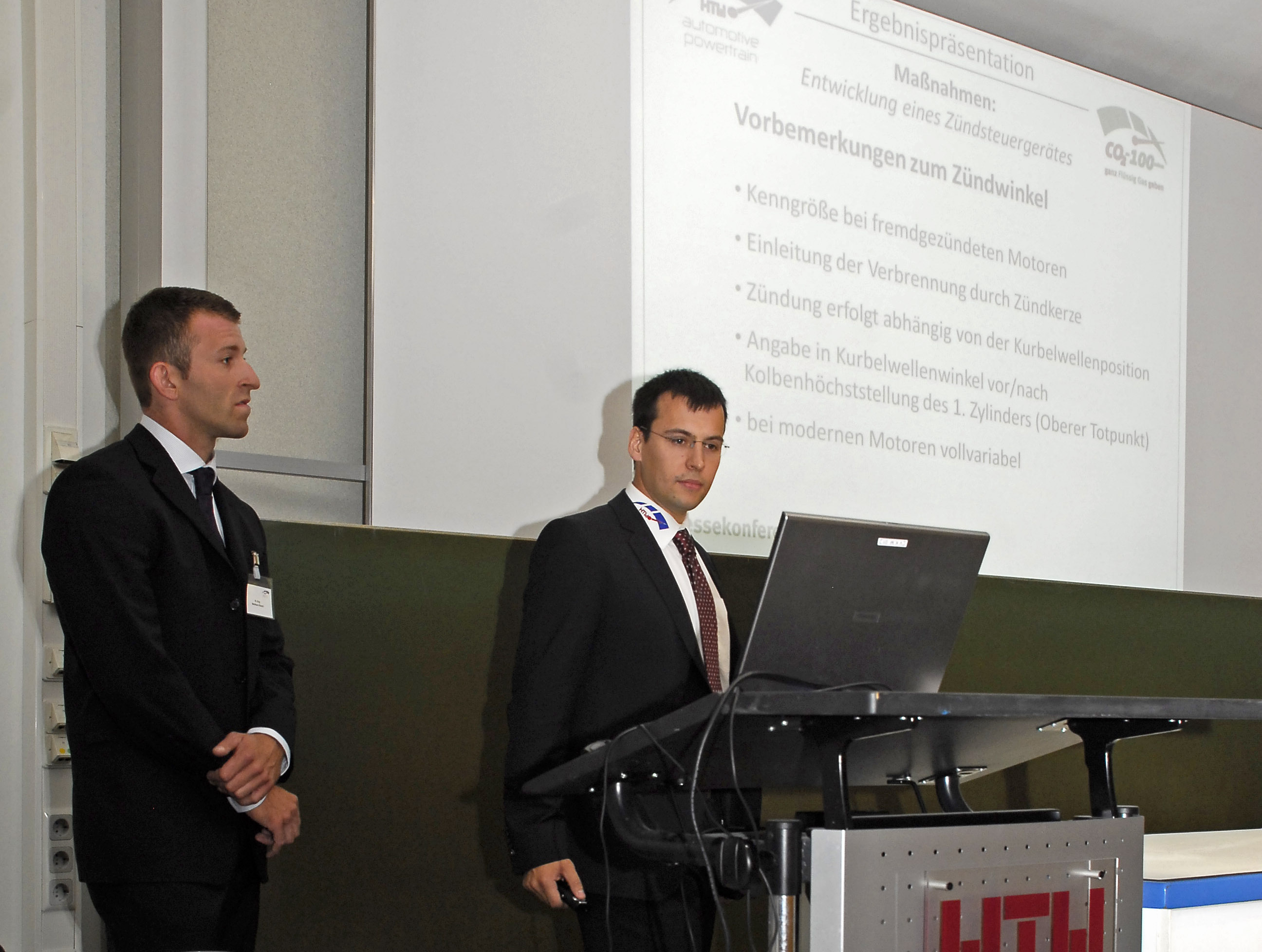 Wolfram Kirsch und Jochen Diehl aus dem Kreis der Studierenden erläuterten den Zuhörern, wie das Steuergerät entwickelt wurde und welchen Vorteil die Verdichtungserhöhung bringt. Foto: Projekt CO2-100minus/Fontaine