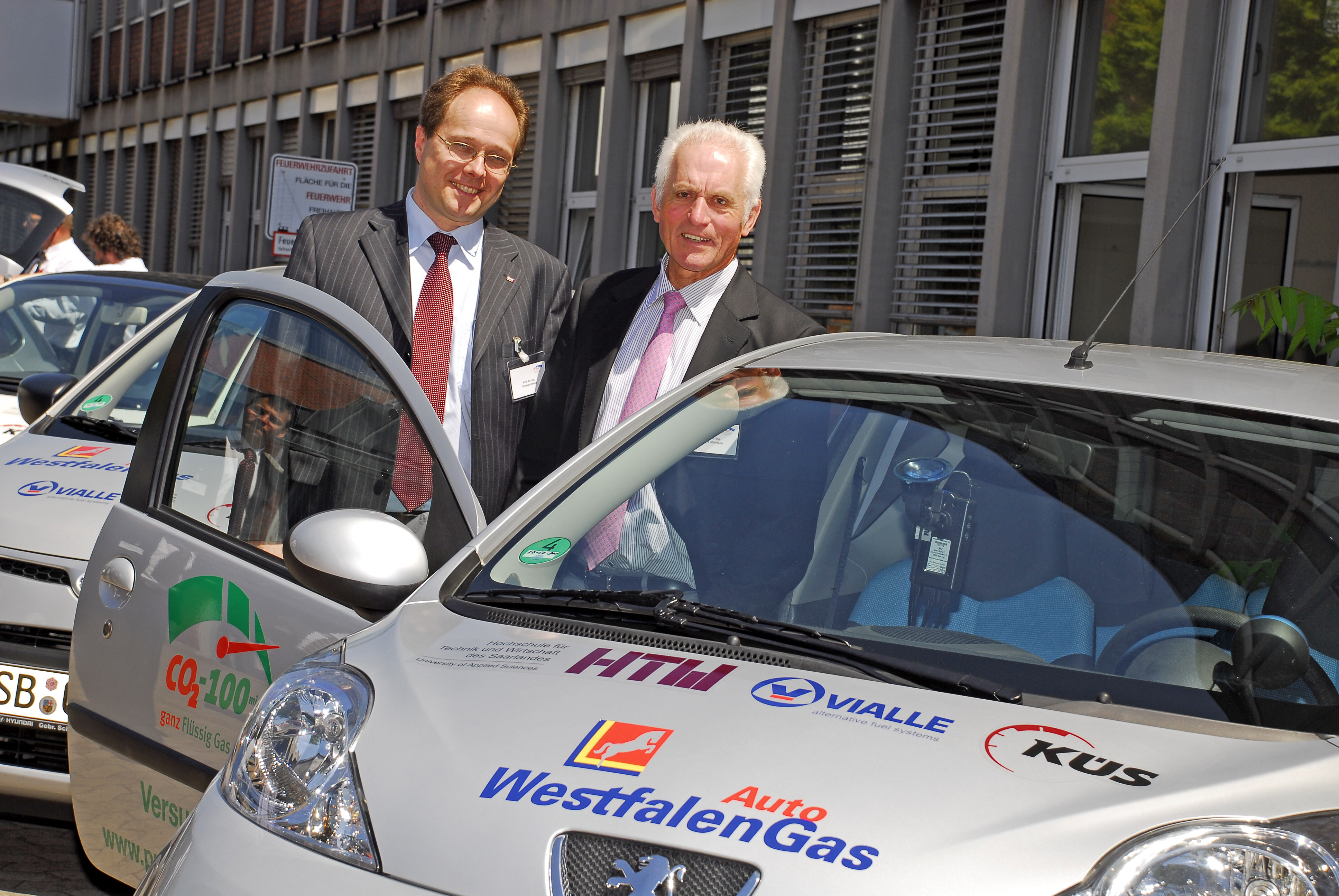 Die Forschungsgruppe automotive powertrain um die Professoren Dr. Thomas Heinze (l.) und Dr. Harald Altjohann (r.) drückte den CO2-Ausstoß dieses Peugeots 107 um 18 Prozent auf 90,9 Gramm pro Kilometer. Foto: Projekt CO2-100minus/Fontaine