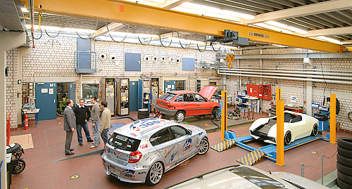 Praxisnahe Forschung wird im Fachbereich Maschinenbau groß geschrieben. Dazu gehören auch Versuchslabore, wie hier das für Verbrennungskraftmaschinen, in dem zum Beispiel der 1-er BMW des Projektes v300plus – Vorgänger des Projektes CO2-100minus – für seinen Weltrekordversuch vorbereitet wurde. Foto: HTW Saarland